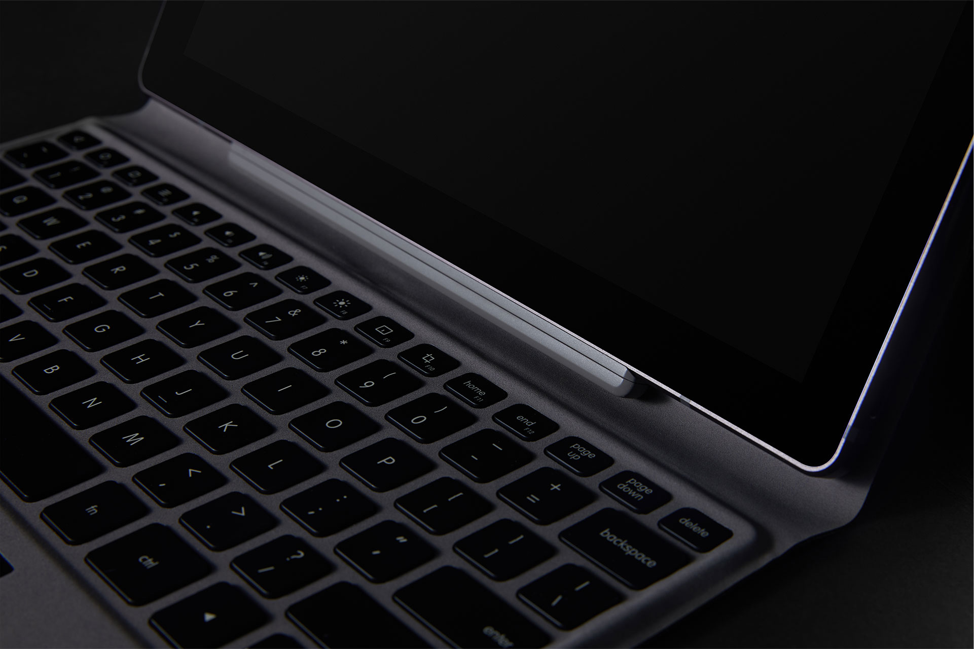 兼具保護(hù)套功能的超薄鍵盤,與支撐功能合二為一,大角度旋轉(zhuǎn)支架可以支持平板